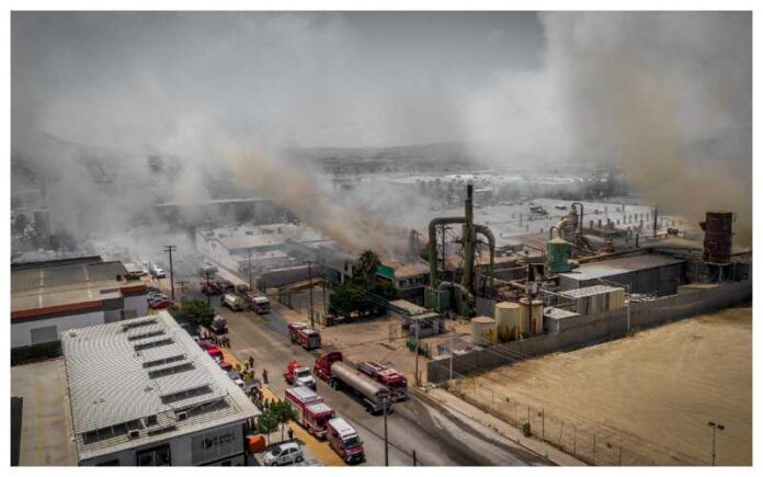 TIJUANA, JULIO 21, 2025 -Un incendio se registró este lunes en la bodega de una fábrica de producción de tablas de triplay, ubicada sobre la calle 11 Norte y el bulevar Industrial, en la colonia Ciudad Industrial.