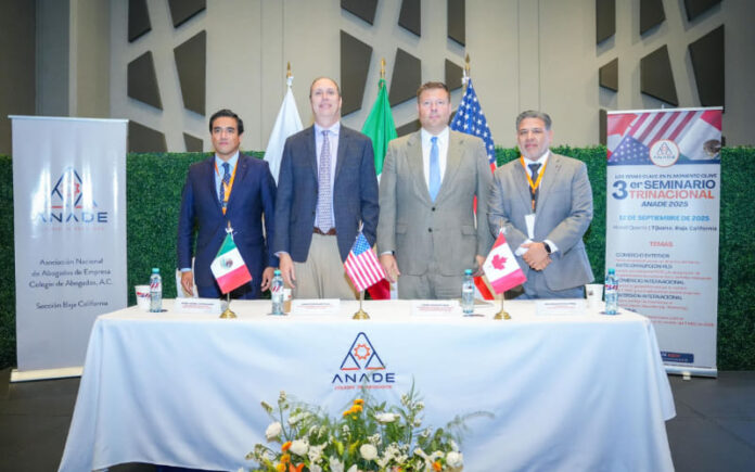 TIJUANA, SEPTIEMBRE 13, 2025.- La Asociación Nacional de Abogados de Empresa (ANADE), de la mano con su sección Baja California, inauguró su Tercer Seminario Trinacional, un encuentro que reúne a especialistas de México, Estados Unidos y Canadá para analizar los principales retos y oportunidades del derecho internacional y fortalecer la colaboración jurídica y económica entre las tres naciones.