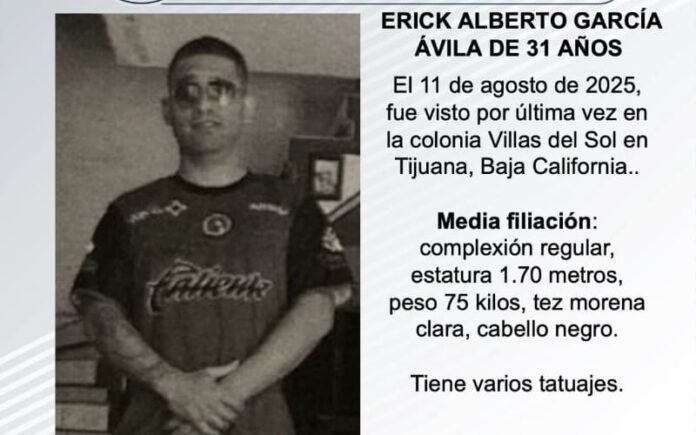 TIJUANA, OCTUBRE 6, 2025.- La Fiscalía General del Estado (FGE), solicita el apoyo de la ciudadanía para localizar a Erick Alberto García Ávila de 31 años de edad.