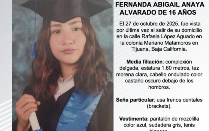 TIJUANA, OCTUBRE 30, 2025.- La Fiscalía General del Estado (FGE), solicita el apoyo de la ciudadanía para localizar a Fernanda Abigail Anaya Alvarado de 16 años de edad.