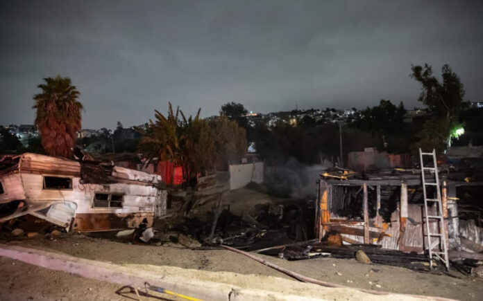 TIJUANA, NOVIEMBRE 7, 2025.- Una casa ubicada en el Cañón del Padre, a un costado de la Vía Rápida Alamar y el bulevar Gato Bronco, quedó completamente consumida por el fuego, junto con una traila contigua, durante la noche de este jueves.