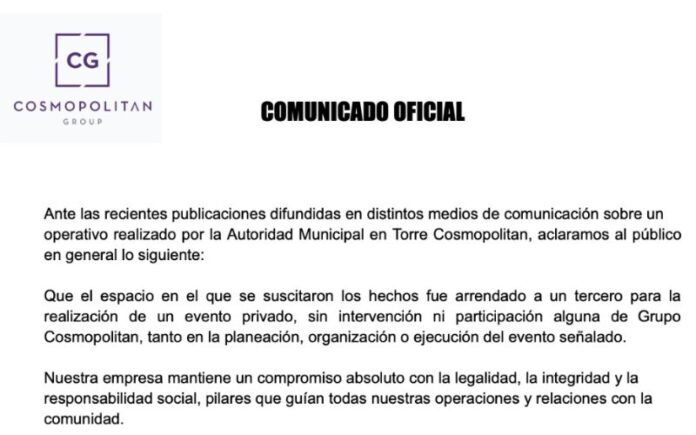 TIJUANA, NOVIEMBRE 4, 2025.– Tras la difusión en redes sociales y medios de comunicación de un operativo llevado a cabo por autoridades municipales en un evento privado dentro de Torre Cosmopolitan, la empresa “Grupo Cosmopolitan” emitió un comunicado para aclarar su postura y deslindarse de lo ocurrido.