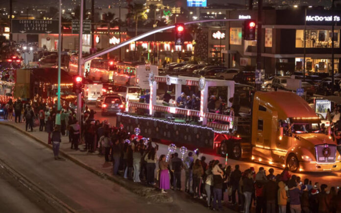 TIJUANA, DICIEMBRE 20, 2025.- El bulevar Insurgentes se llenó de luces, música y familias durante la caravana navideña que recorrió esta vialidad y reunió a decenas de personas, entre ellas padres que cargaban a sus hijos sobre los hombros para que pudieran observar el desfile.
