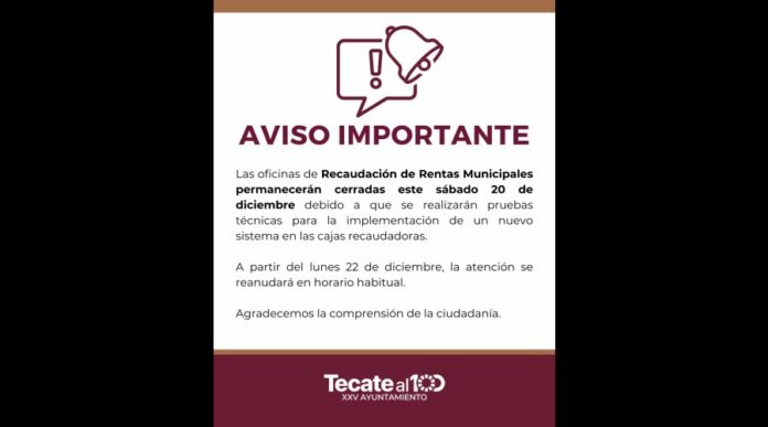 TECATE, DICIEMBRE 19, 2025.- El Gobierno de Tecate informó que este sábado 20 de diciembre las oficinas de Recaudación de Rentas Municipales permanecerán cerradas al público, debido a la realización de pruebas técnicas para la implementación de un nuevo sistema en las cajas recaudadoras.