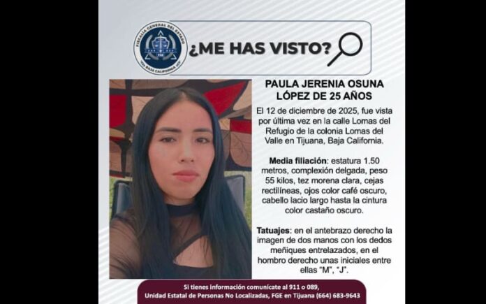 TIJUANA, DICIEMBRE 15, 2025.- La Fiscalía General del Estado (FGE), solicita el apoyo de la ciudadanía para localizar a Paula Jerenia Osuna López de 25 años de edad.