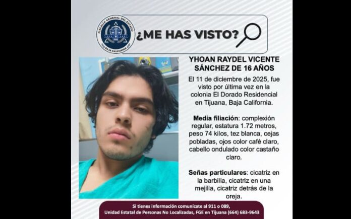 TIJUANA, DICIEMBRE 15, 2025.- La Fiscalía General del Estado (FGE), solicita el apoyo de la ciudadanía para localizar a Yhoan Raydel Vicente Sánchez de 16 años de edad.