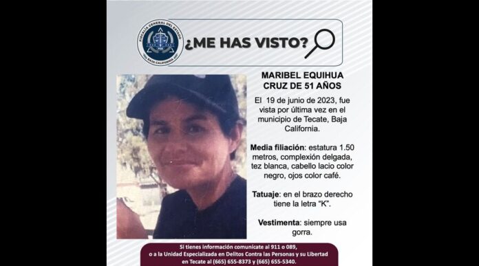 TECATE, ENERO 28, 2026.– La Fiscalía General del Estado (FGE) solicitó el apoyo de la ciudadanía para localizar a Maribel Equihua Cruz, de 51 años de edad, quien se encuentra en calidad de no localizada desde el año 2023.