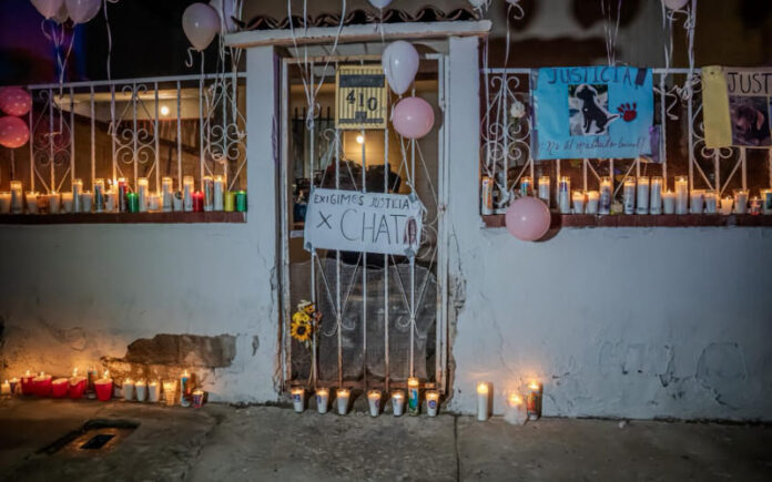TIJUANA, ENERO 5, 2026.- Con veladoras encendidas y globos blancos, activistas en defensa de los animales y vecinos se reunieron a las afueras de la vivienda ubicada sobre la calle Antropólogo en colonia Otay Jardín, donde vivía el perrito conocido inicialmente como “La Chatita”, para despedirlo y exigir justicia tras su muerte violenta, presuntamente a manos de su propio dueño.