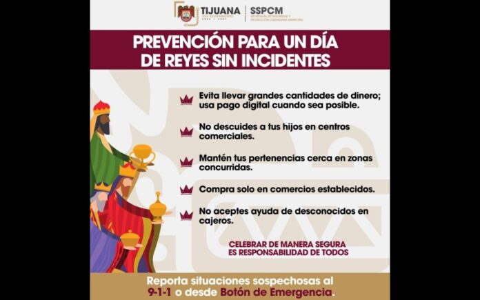 TIJUANA, ENERO 5, 2026.- Con motivo de las celebraciones del Día de Reyes, la Secretaría de Seguridad y Protección Ciudadana Municipal (SSPCM) exhortó a la ciudadanía a tomar medidas preventivas al realizar compras en centros comerciales, plazas y zonas de alta afluencia, con el objetivo de prevenir incidentes y salvaguardar la integridad de las familias.