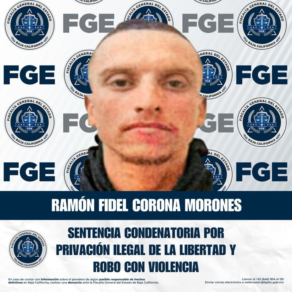 TECATE, ENERO 26, 2026 .-Gracias a las directrices de la Fiscal General del Estado, Dra. Ma. Elena Andrade Ramírez, orientadas a no permitir la impunidad en Baja California, la Fiscalía Regional de Tecate obtuvo una sentencia condenatoria contra Ramón Fidel Corona Morones por los delitos de privación de la libertad agravada, robo con violencia y robo de vehículo ejecutado con violencia.