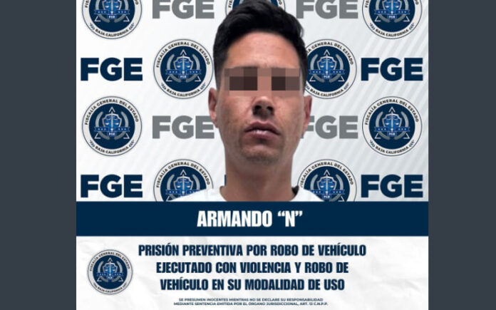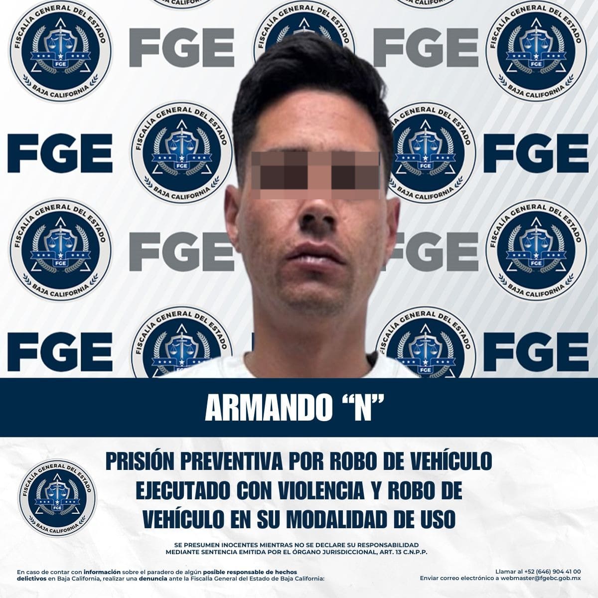 TIJUANA, ENERO 5, 2026.- La fiscalía regional de Tijuana, a través de la Unidad de Investigación de Robo de Vehículos, logró la vinculación a proceso y la medida cautelar de prisión preventiva justificada en contra de Armando “N”, por su presunta responsabilidad en los delitos de robo de vehículo ejecutado con violencia y robo de vehículo de motor en su modalidad de uso, hechos registrados en la colonia Camino Verde.