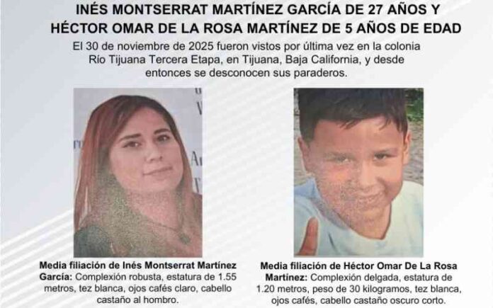 TIJUANA, ENERO 6, 2026.- La Fiscalía General del Estado (FGE) solicita el apoyo de la ciudadanía para localizar a Inés Montserrat Martínez García, de 27 años, y Héctor Omar De La Rosa Martínez, de 5 años de edad.