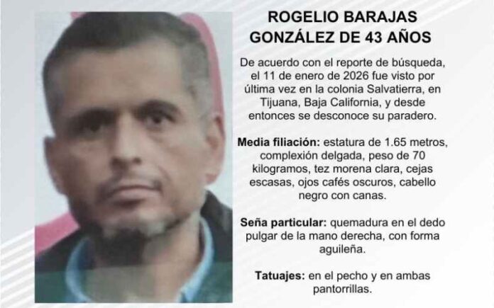 TIJUANA, ENERO 20, 2026.- La Fiscalía General del Estado (FGE) solicita el apoyo de la ciudadanía para localizar a Rogelio Barajas González, de 43 años de edad.