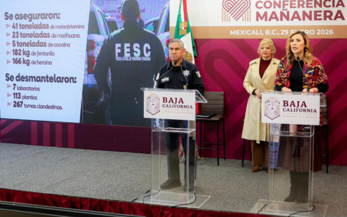 Asimismo, destacó que Baja California se ubica entre las entidades con mayores aseguramientos a nivel nacional, con el decomiso de 41 toneladas de metanfetamina, 23 toneladas de marihuana, 5 toneladas de cocaína, 182 kilogramos de fentanilo y 166 de heroína, además del desmantelamiento de laboratorios, plantíos y tomas clandestinas.