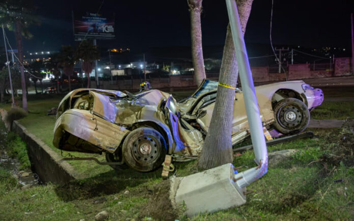 TIJUANA, FEBRERO 21, 2026.- Un hombre de aproximadamente 45 años resultó lesionado la madrugada de este sábado luego de impactar su vehículo contra un poste de alumbrado público sobre el bulevar Rosas Magallón, a la altura del retorno de la plaza El Pacífico.