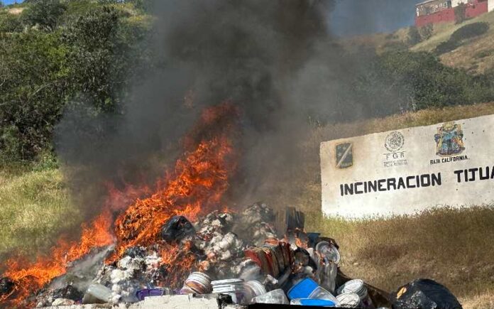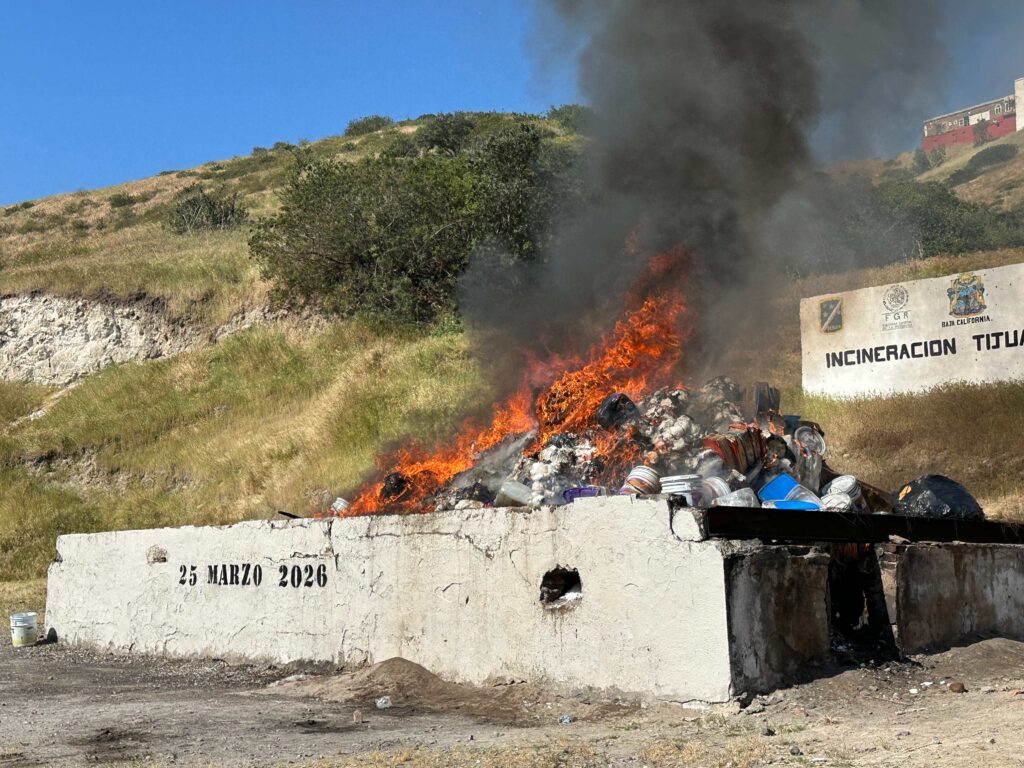 TIJUANA, MARZO 25, 2026.- Autoridades de los tres órdenes de gobierno llevaron a cabo este miércoles la incineración de diversas drogas aseguradas en operativos realizados en la región, como parte de las acciones para combatir el narcotráfico en Baja California.