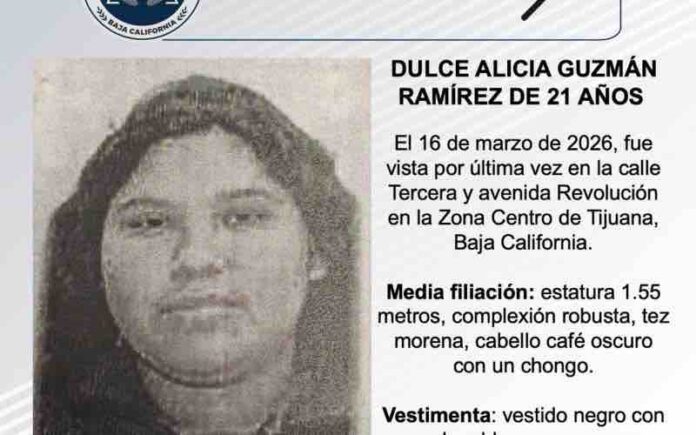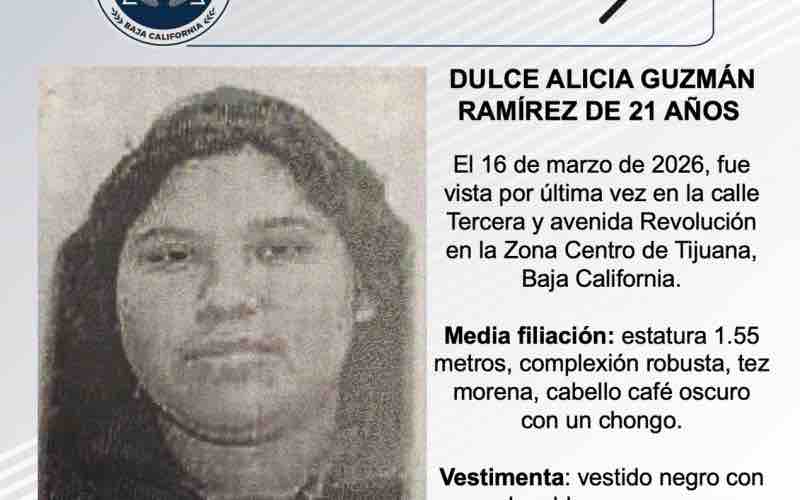 TIJUANA, MARZO 17, 2026.-La Fiscalía General del Estado solicita el apoyo de la ciudadanía para localizar a Dulce Alicia Guzmán Ramírez de 21 años de edad.