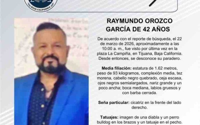 TIJUANA, MARZO 24, 2026.-La Fiscalía General del Estado (FGE) solicita el apoyo de la ciudadanía para la localización de Raymundo Orozco García, de 42 años de edad, quien está diagnosticado con esquizofrenia.