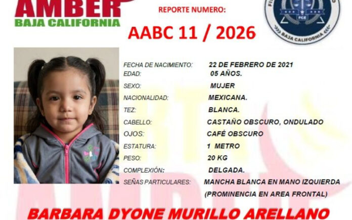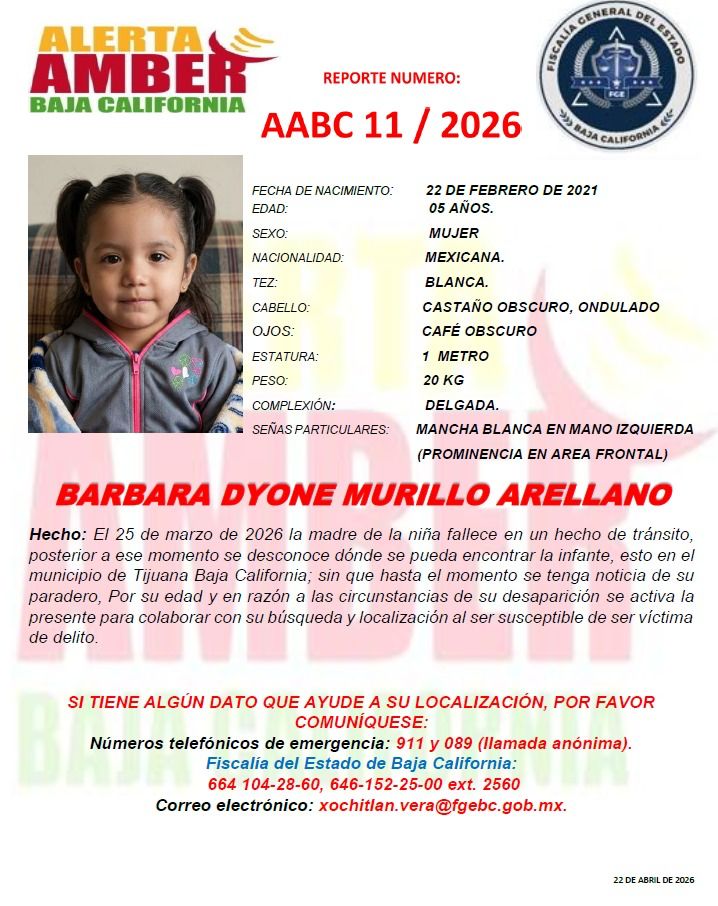 TIJUANA, ABRIL 22, 2026.- La Fiscalía General de Baja California activó la Alerta Amber para localizar a la menor Bárbara Dyone Murillo Arellano, de 5 años de edad.