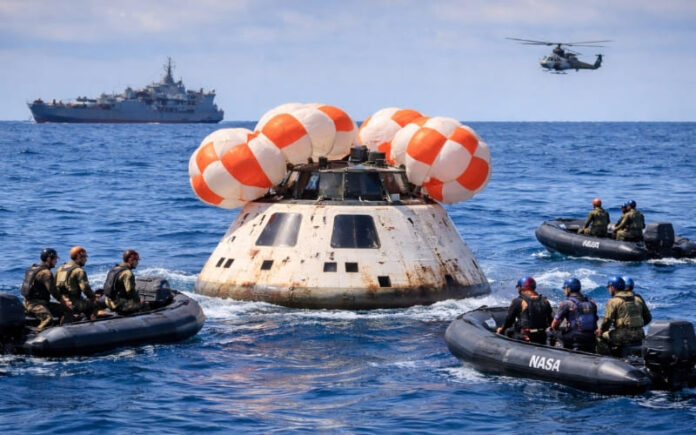 OCÉANO PACÍFICO, TIJUANA, ABRIL 10, 2026.- La nave espacial Orion, correspondiente a la misión Artemis II, amerizó con éxito en aguas del océano Pacífico, marcando un nuevo avance en los planes de exploración lunar de la NASA.