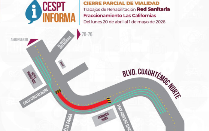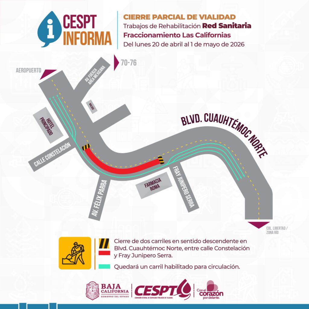 TIJUANA, ABRIL 19, 2026 .- La Comisión Estatal de Servicios Públicos de Tijuana (CESPT) informó que del 20 de abril al 1 de mayo realizará trabajos de rehabilitación del alcantarillado sanitario en un tramo de 200 metros del bulevar Cuauhtémoc Norte, a la altura del fraccionamiento Las Californias.