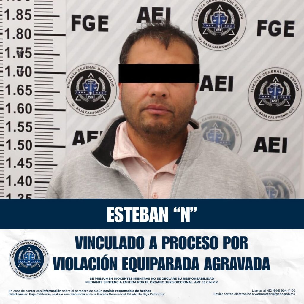 TIJUANA, ABRIL 9, 2026 .- La Fiscalía General del Estado (FGE) informa que, como resultado de la presentación de elementos probatorios contundentes, se obtuvo la vinculación a proceso de un hombre identificado como Esteban “N”, presunto responsable del delito de violación equiparada agravada en contra de una menor de 12 años.