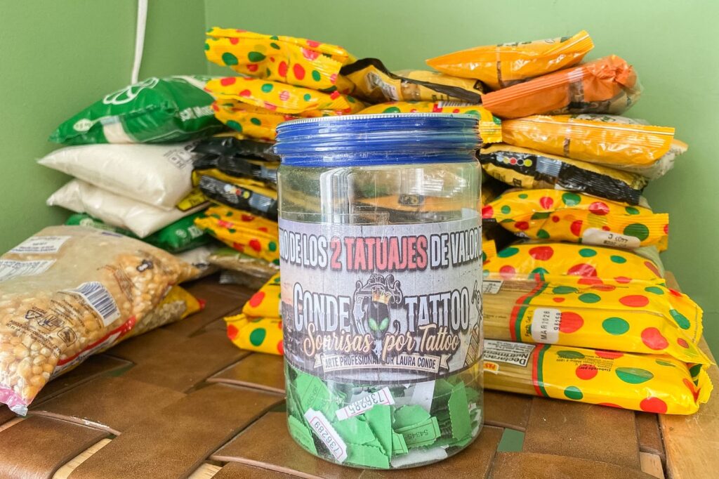 Por su parte, Conde explicó que cada producto donado se traduce en boletos foliados para participar en la rifa de dos tatuajes con valor de 4 mil pesos cada uno, realizados por la propia artista.