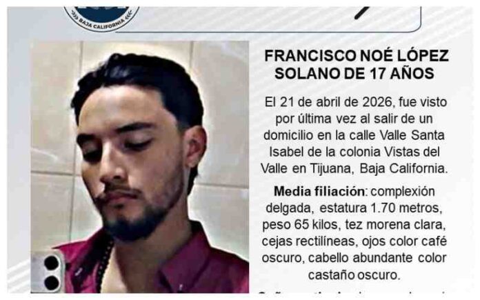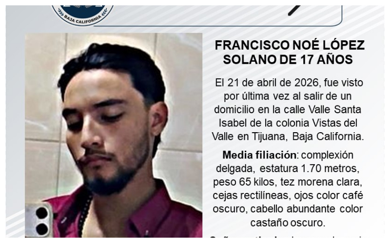 TIJUANA, 21 DE ABRIL DE 2026.- La Fiscalía General del Estado (FGE), solicita el apoyo de la ciudadanía para localizar a Francisco Noé López Solano de 17 años de edad.