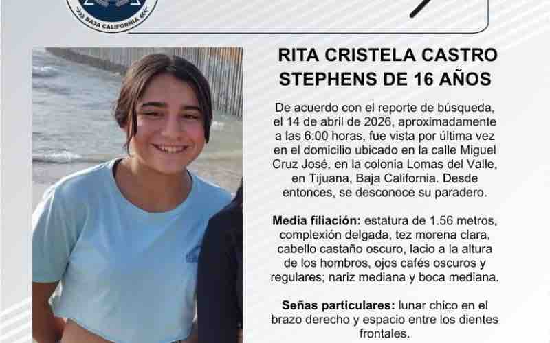TIJUANA, ABRIL 17, 2026.-La Fiscalía General del Estado (FGE) solicita el apoyo de la ciudadanía para la localización de Rita Cristela Castro Stephens, de 16 años de edad.