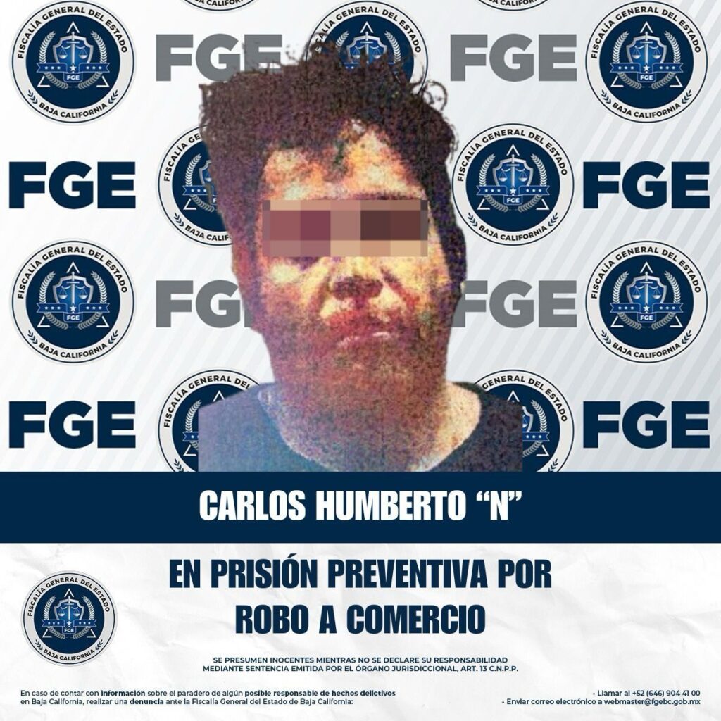 TIJUANA, ABRIL 20, 2026 .- La Fiscalía General del Estado obtuvo la medida cautelar de prisión preventiva justificada en contra de Carlos Humberto “N”, por su presunta responsabilidad en el delito de robo calificado a establecimiento comercial abierto al público.