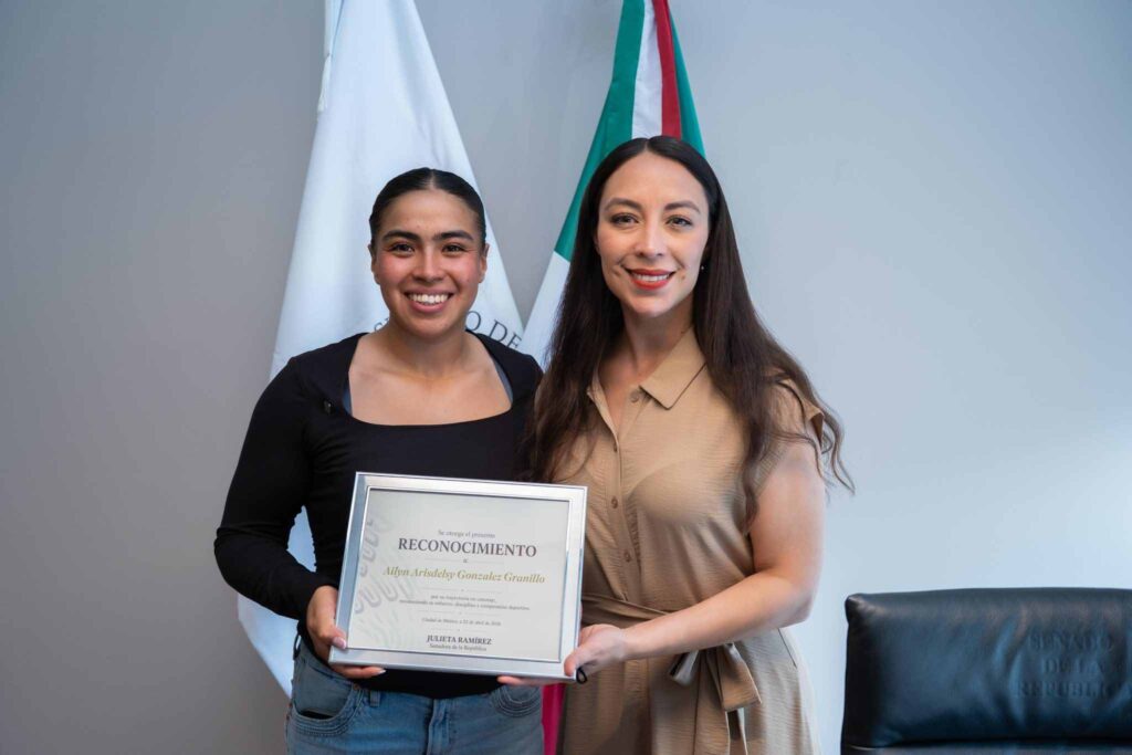 CDMX, ABRIL 22, 2026.- En reconocimiento a su destacada trayectoria en el deporte del canotaje, la senadora Julieta Ramírez distinguió a la atleta tijuanense Ailyn González por su disciplina, esfuerzo y compromiso, cualidades que la han llevado a poner en alto el nombre de Baja California en competencias nacionales e internacionales.
