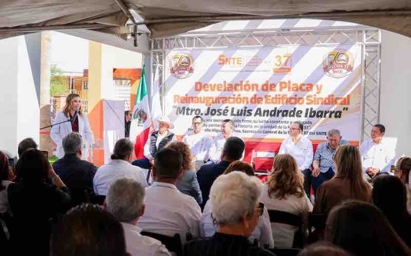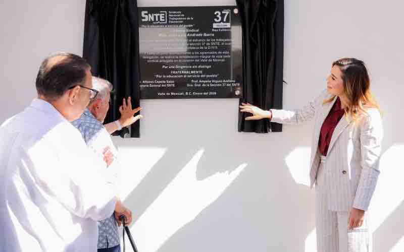 La mandataria también fue testigo de la reinauguración del edificio sindical de la Sección 37 en el Valle de Mexicali, que ahora lleva el nombre de José Luis Andrade Ibarra, docente jubilado y exsecretario general del sindicato, a quien reconoció como un actor fundamental en la conquista de los derechos del magisterio en México y en Baja California.