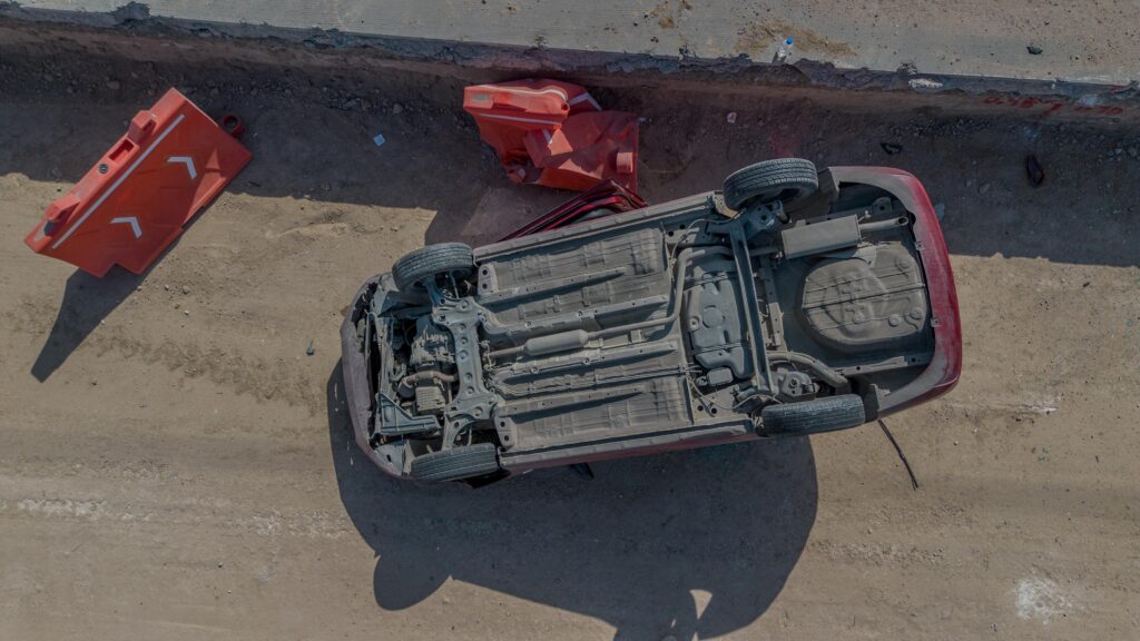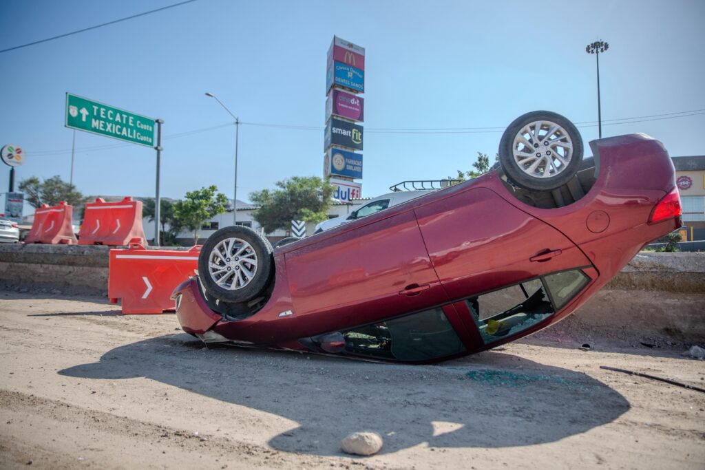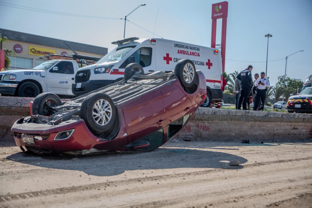 El incidente involucró a un automóvil Chevrolet Aveo de color rojo, con placas de Baja California, que terminó volcado con las llantas hacia arriba sobre la zona de construcción de los carriles confinados.